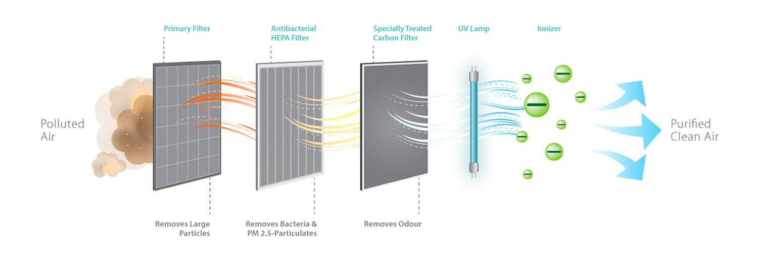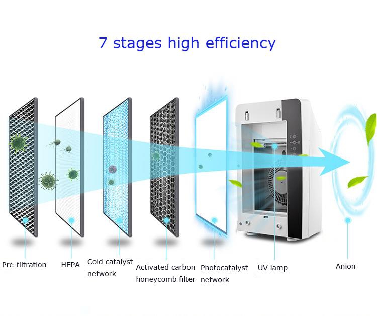 โดยเครื่องฟอกอากาศนี้จะมีไส้กรอง หรือแผ่นกรองอากาศ HEPA (High Efficiency Particulate Air Filter) ที่ทำหน้าที่ดักจับสสารและฝุ่นละอองที่มีอนุภาคขนาดเล็กตั้งแต่ 0.1 - 0.3 ไมครอน เข้าไปในเครื่องก่อนจะทำการฟอกและปล่อยอากาศที่ผ่านการกรองแล้วออกมา ทำให้ในพื้นที่ที่ใช้งานเครื่องฟอกอากาศมีจำนวนฝุ่นในอากาศที่น้อยกว่า แต่ผู้ใช้ก็ต้องเลือกใช้งานเครื่องฟอกอากาศที่มีขนาดเหมาะสมกับพื้นที่ภายในห้องเพื่อประสิทธิภาพในการฟอกอากาศที่ดีด้วยเช่นกัน