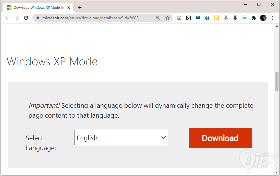 ให้เราไปที่ URL : https://www.microsoft.com/en-us/download/details.aspx?id=8002 เลื่อนลงมาด้านล่าง ใต้โฆษณาของ Surface จะมีปุ่มให้ดาวน์โหลด Windows XP Mode อยู่ คลิกดาวน์โหลดเพื่อไฟล์ WindowsXPMode_en-us.exe ขนาดประมาณ 469.8 MB. มาเก็บไว้บนเครื่องคอมพิวเตอร์ของเราก่อน