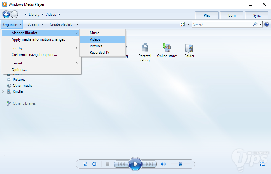 วิธีการ คือ ให้เราเปิด Windows media Player ขึ้นมา ถ้าไม่รู้ว่าโปรแกรมนี้อยู่ไหน คลิกปุ่ม Start แล้วพิมพ์ค้นหหาเอาก็ได้ครับ จากนั้นก็คลิกที่ปุ่ม Organize → Manage libraries ก็จะมีให้เลือกว่าเราจะจัดการกับไฟล์ประเภทไหนครับ ก็จะมี Music (เพลง), Videos (วิดีโอ), Pictures (ภาพ) และ Recorded TV (บันทึกรายการทีวี) ซึ่งผมก็จะเลือกจัดการ Videos