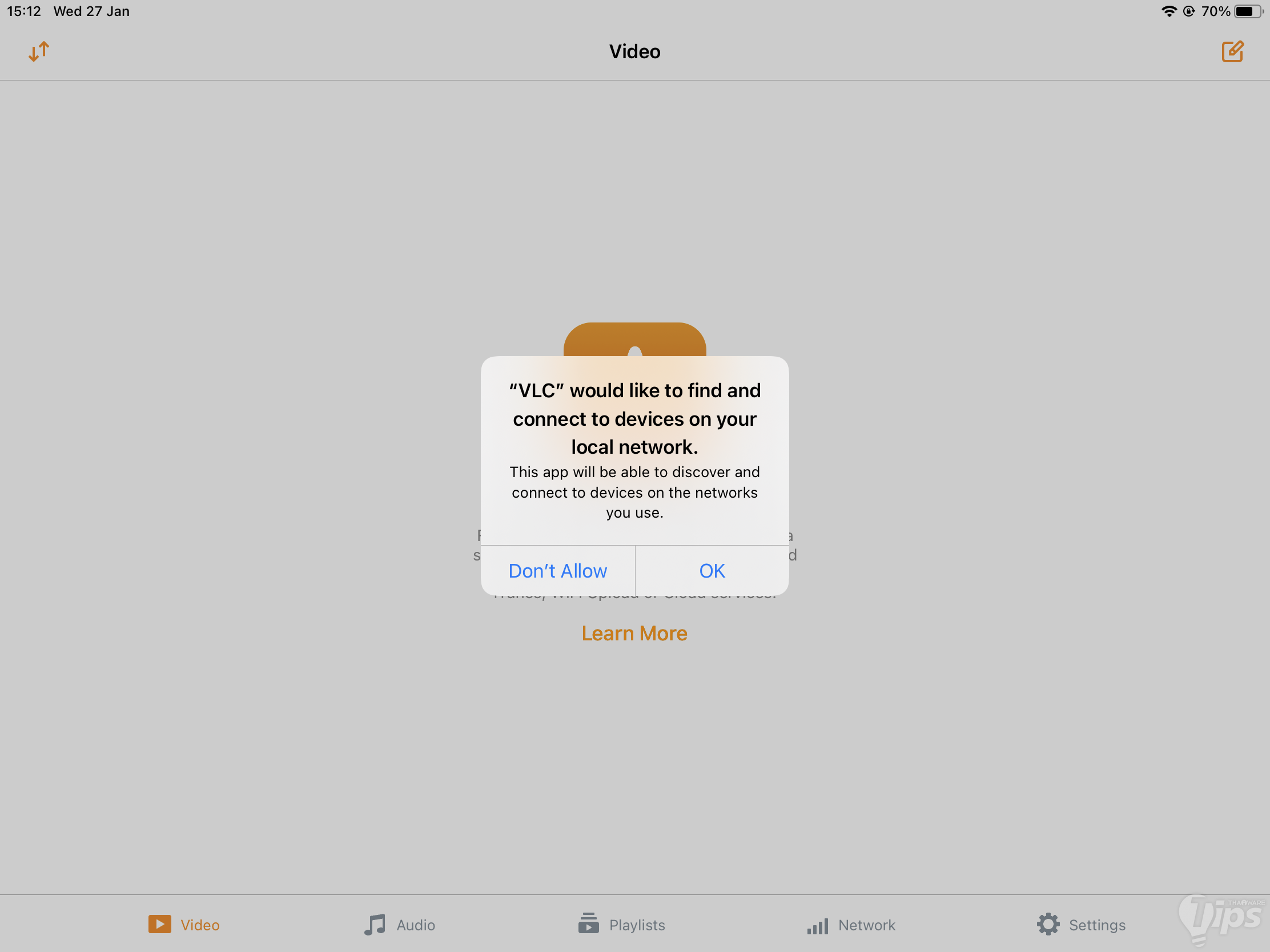 เมื่อเปิดแอปพลิเคชัน VLC ขึ้นมาครั้งแรก จะมีการขออนุญาตเชื่อมต่อไปยังอุปกรณ์อื่นที่อยู่ในเน็ตเวิร์ค ต้องแตะ OK นะครับ อุปกรณ์ของเราจะได้เข้าถึงไฟล์บนคอมพิวเตอร์ของเราได้