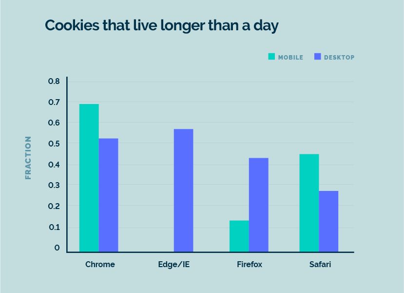 IDFA นั้นมีอายุการเก็บที่ยาวนานมาก สามารถพูดได้ว่ามันอยู่เหมือนเดิมตลอดจนกว่าผู้ใช้จะไปทำการรีเซ็ตค่ามันด้วยตัวเอง ซึ่งน้อยคนที่จะไปรีเซ็ตค่านี้ หรือไม่รู้ด้วยซ้ำว่าสามารถรีเซ็ตได้ โดยพวก 3rd-party Cookie จะมีอายุเฉลี่ยดังกราฟด้านล่างนี้ครับ