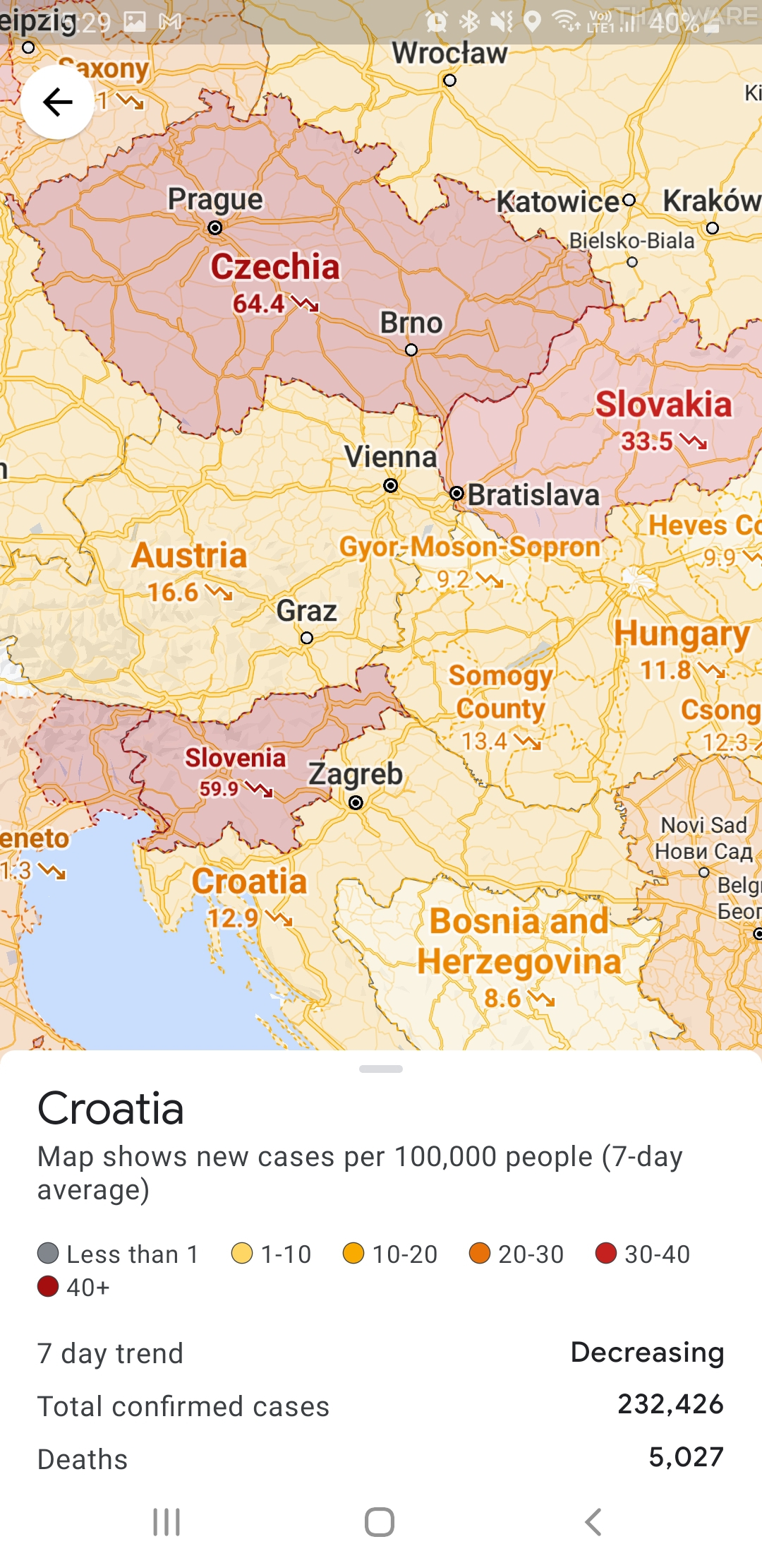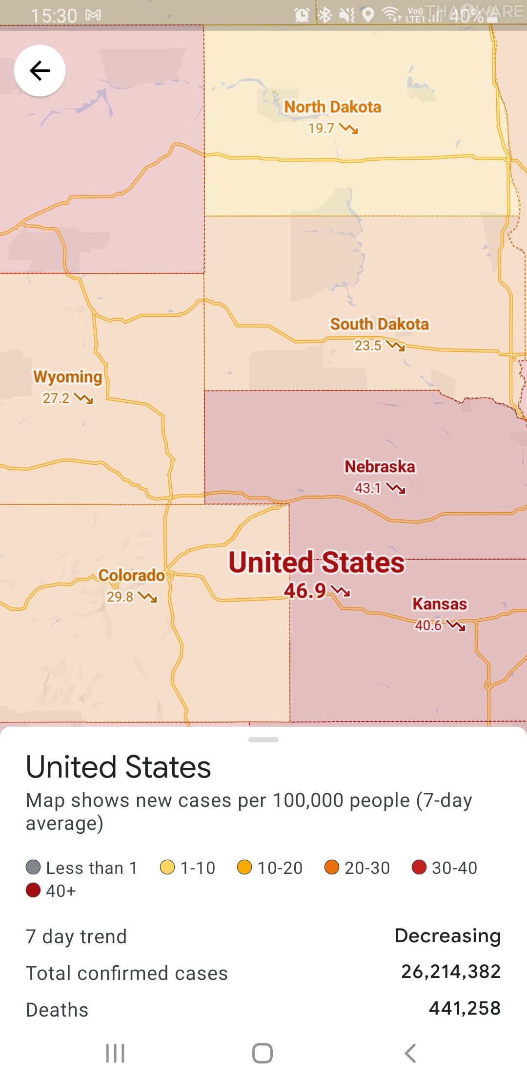 โดยทาง Google Maps จะแสดงข้อมูลเคสผู้ติดเชื้อย้อนหลัง 7 วัน ต่อจำนวนประชากร 1 แสนคน แนวโน้มที่ผู้ติดเชื้อจะเพิ่มขึ้นหรือลดลง จำนวนผู้ติดเชื้อที่ยืนยันแล้วและผู้เสียชีวิต ซึ่งในประเทศไทยและประเทศเพื่อนบ้านอยู่ในระดับ 0.9 มีจำนวนเคสน้อยมาก ๆ และแสดงผลเป็นสีเทา