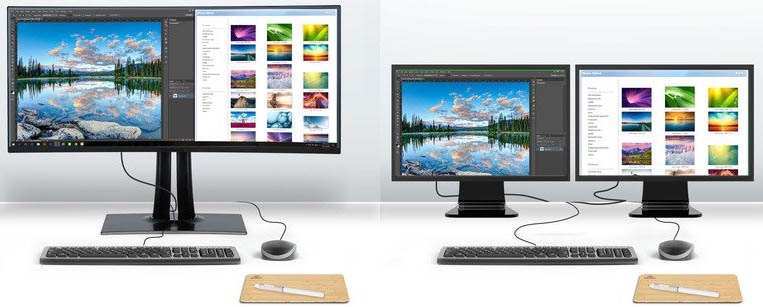 ทำให้บางคนเลือกที่จะใช้งานแบบ Dual Monitors แทน วิธีนี้นอกจากจะได้พื้นที่การใช้งานเพิ่มขึ้นเยอะกว่าแล้ว ยังแบ่งพื้นที่ใช้งานได้ง่ายด้วย แต่ข้อเสีย คือ เราต้องทนความน่ารำคาญของขอบหน้าจอที่อยู่ตรงกลางให้ได้
