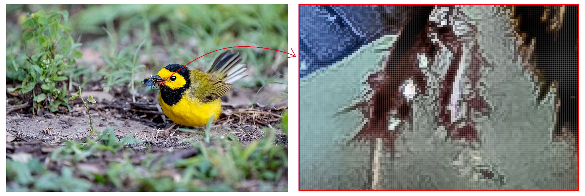 ลองดูภาพนกกระจิบด้านล่างนี้ (อย่าลืมคลิกที่ภาพเพื่อขยาย) ด้านซ้ายเป็นภาพที่ขนาดปกติ ส่วนฝั่งขวาเป็นภาพแมลงที่น้องนกคาบเอาไว้ในปาก โดยใช้ Photoshop ซูมขยาย 1,600 เท่า จะเห็นการเรียงตัวของ Pixel ได้อย่างชัดเจน