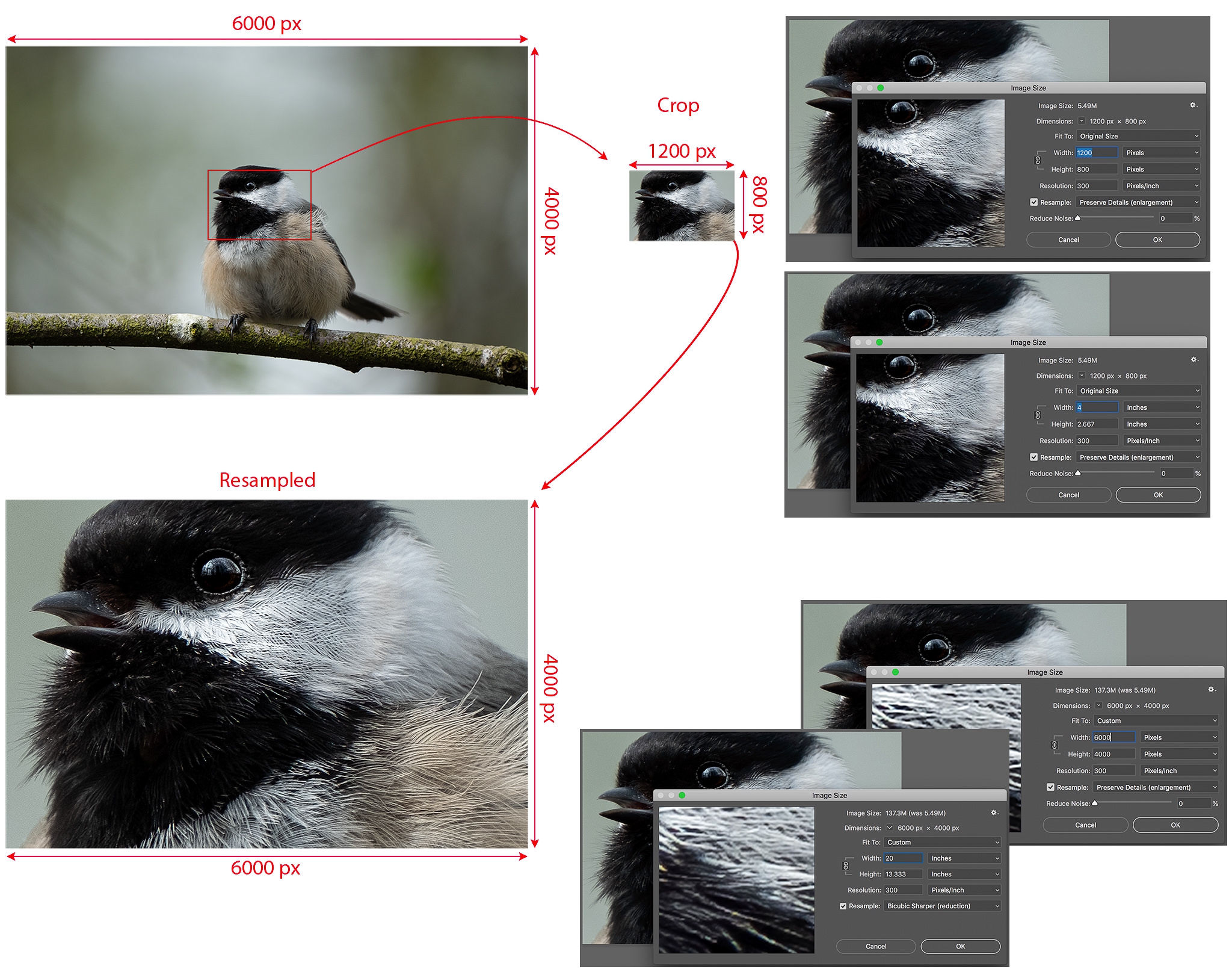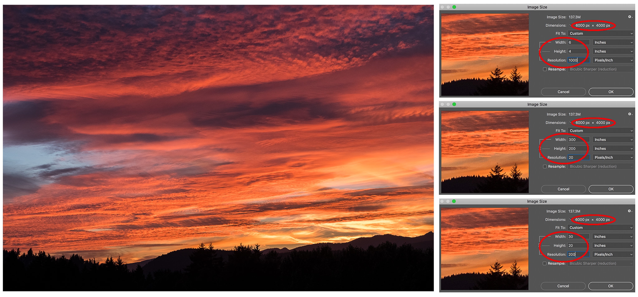 แต่ละ Paper pixel นี้ จะเป็นตัวแทนของ Pixel ในไฟล์รูปดิจิทัล ทีนี้ ให้เราลองไปดูที่ขนาดของรูปภาพใน Photoshop (อย่าลืมเอาเครื่องหมายถูก ☑ ในช่อง Resample ออก) เมื่อเราเปลี่ยนค่าความละเอียด (Resolution) จำนวนพิกเซลของภาพจะไม่เปลี่ยนแปลง เท่าเดิมที่ 6,000 × 4,000 พิกเซลเสมอ แต่ขนาดของภาพจะเปลี่ยนแปลงไปตามความละเอียด