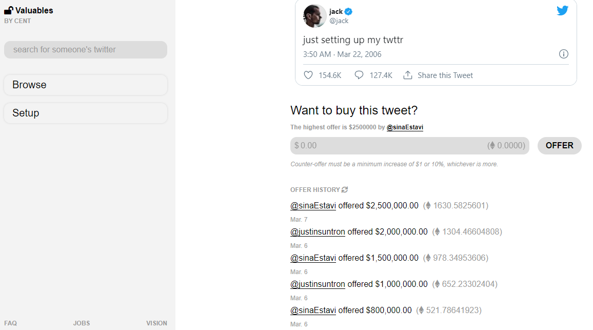 นอกจากนี้ ความพิเศษอีกอย่างหนึ่งของ NFT นี้ก็คือ แต่ละ Token จะมีค่าไม่เท่ากัน อีกด้วย เพราะมันจะมีความ “พิเศษเฉพาะ” สำหรับผลงานชิ้นนั้น ๆ ที่ไม่สามารถลอกเลียนแบบได้นั่นเอง ซึ่งผู้ซื้อหลาย ๆ คนก็คาดเดาว่าในอนาคตมันอาจมีมูลค่าที่สูงขึ้นจากเดิม และอาจมีการนำเอาโมเดลดังกล่าวนี้ไปปรับใช้กับการซื้อขายสิ่งอื่น ๆ เพื่อเพิ่มมูลค่าให้กับผลงานต่าง ๆ มากขึ้นด้วย เช่น ผู้ก่อตั้ง Twitter อย่าง Jack Dorsey เองก็ได้เปิดประมูล “ทวีตแรก” ของตัวเองไปด้วย (ตอนนี้สนนราคาอยู่ที่ราว 2.5 ล้านดอลลาห์ หรือกว่า 76 ล้านบาทแล้ว)
