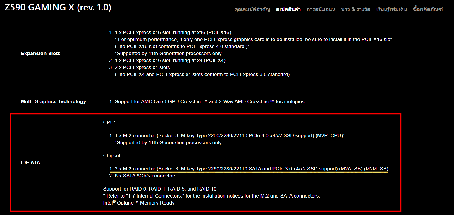 ถ้าหากคุณใช้เมนบอร์ดรุ่นใหม่ ๆ (ไม่เกิน 2 - 3 ปี) ส่วนใหญ่แล้วจะมีช่องใส่สำหรับ SSD มาให้เลยโดยเฉพาะ ซึ่งทางแบรนด์ผู้ผลิตเมนบอร์ดหลายรายในตลาด มักนำจุดนี้มาเป็นจุดขายของเมนบอร์ดตัวเองอยู่แล้ว ทำให้มีข้อมูลอยู่ในหน้าแรกของผลิตภัณฑ์เลย แต่ถ้าไม่แน่ใจ ให้ลองแวะไปดูสเปกโดยละเอียดอีกที หากเห็นคำว่า SSD หรือ M.2 อยู่ นั่นแปลว่าเมนบอร์ดของคุณรองรับการใส่ SSD อยู่แล้ว (เส้นใต้สีเหลือง)
