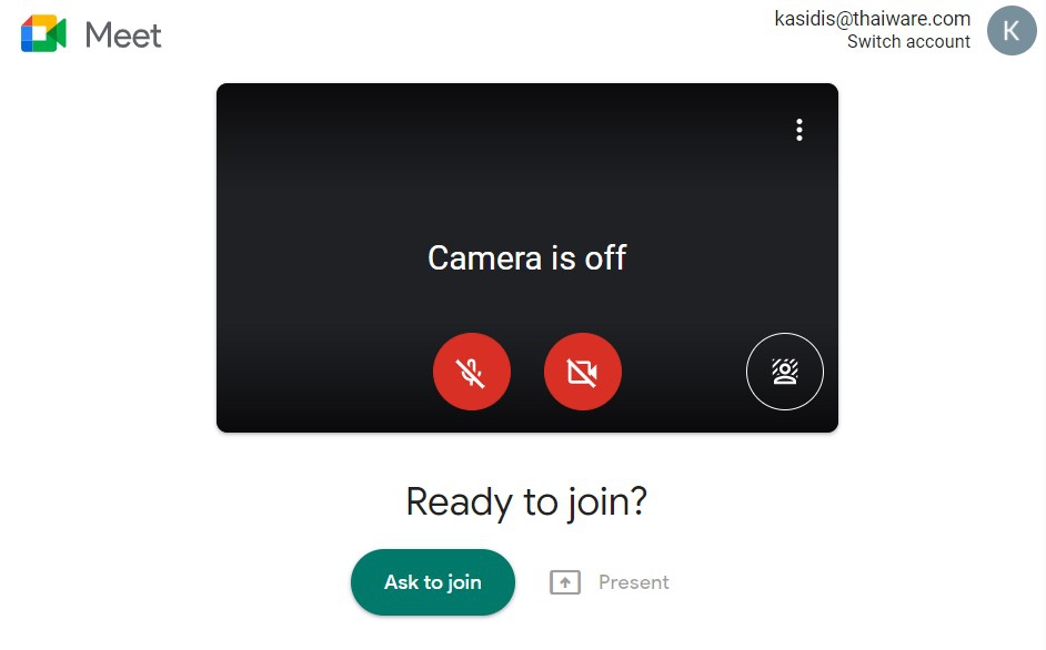 เอาล่ะ หลังจาก Host สร้างลิงก์เสร็จแล้ว วิธีเข้าก็ง่ายเลยครับ แค่คลิกลิงก์ที่แชร์มา ก็จะนำทุกคนไปสู่ห้อง Google Meet ทันที แต่จะยังเข้าไปไม่ได้นะครับ ระบบจะให้รอหน้าห้อง เพื่อเตรียมความพร้อม เช็คกล้อง และ เช็คไมค์ให้พร้อม จากนั้นเมื่อพร้อมแล้วก็กด Join เข้าไปได้เลย