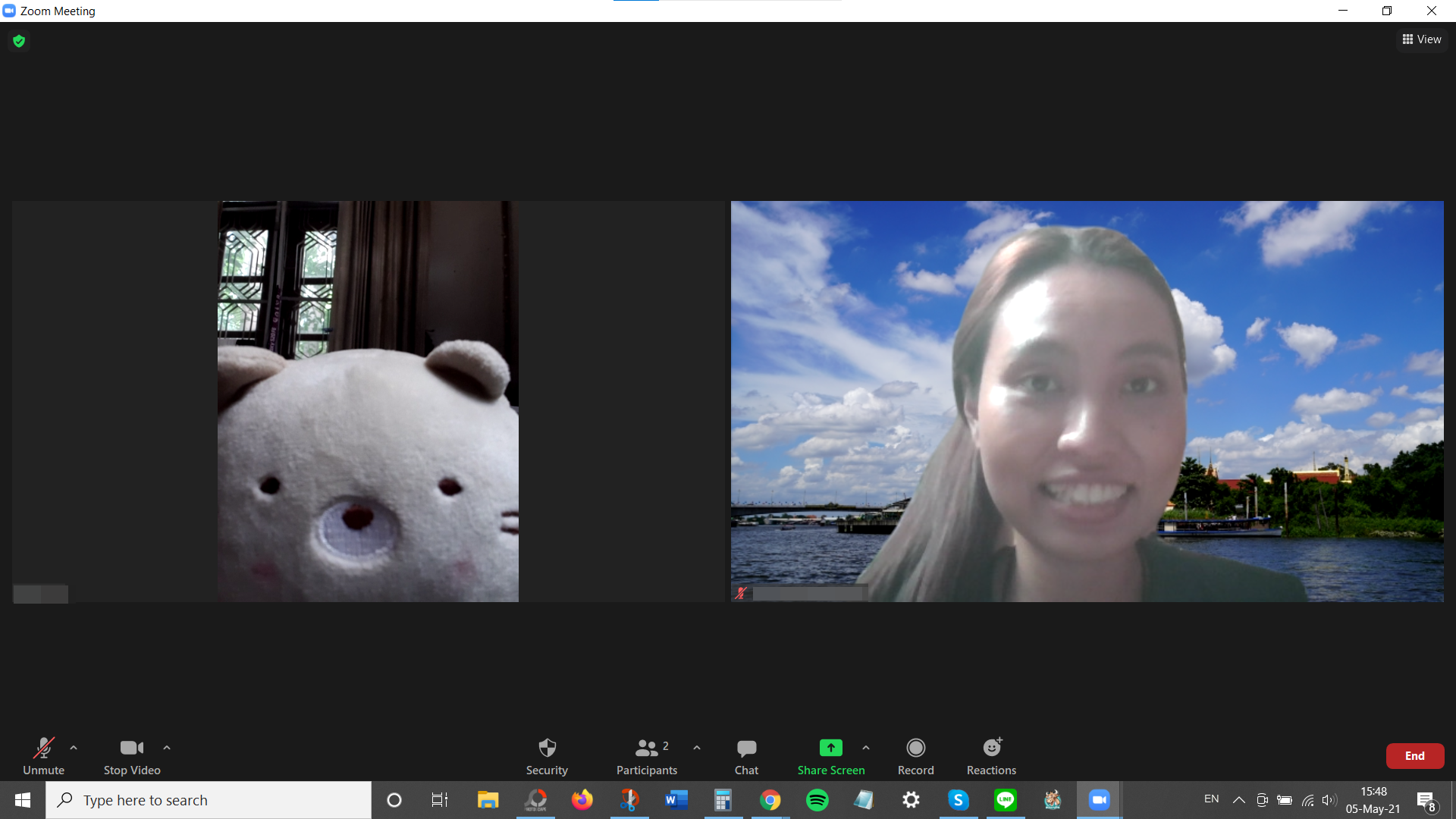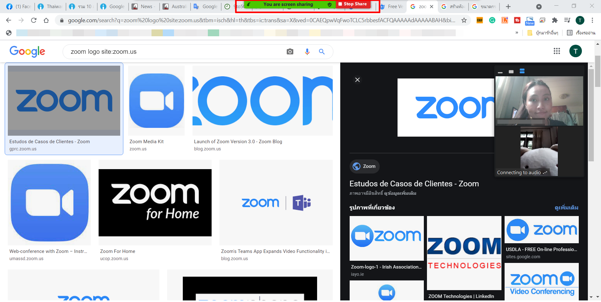 ภาพตัวอย่างด้านล่างนี้คือการแชร์หน้าจอของเว็บเบราว์เซอร์ จะเห็นได้ว่าแสดงผลขนาดใหญ่เต็มจอ มีแถบสีเขียวที่แสดงว่ากำลังอยู่ในสถานะ Share Screen และปุ่มหยุดแชร์หน้าจอสีแดง ส่วนหน้าตาของผู้ร่วมประชุมจะถูกย่อให้เล็กลงแทน หรือจะย่อให้เล็กกว่านี้ก็ได้