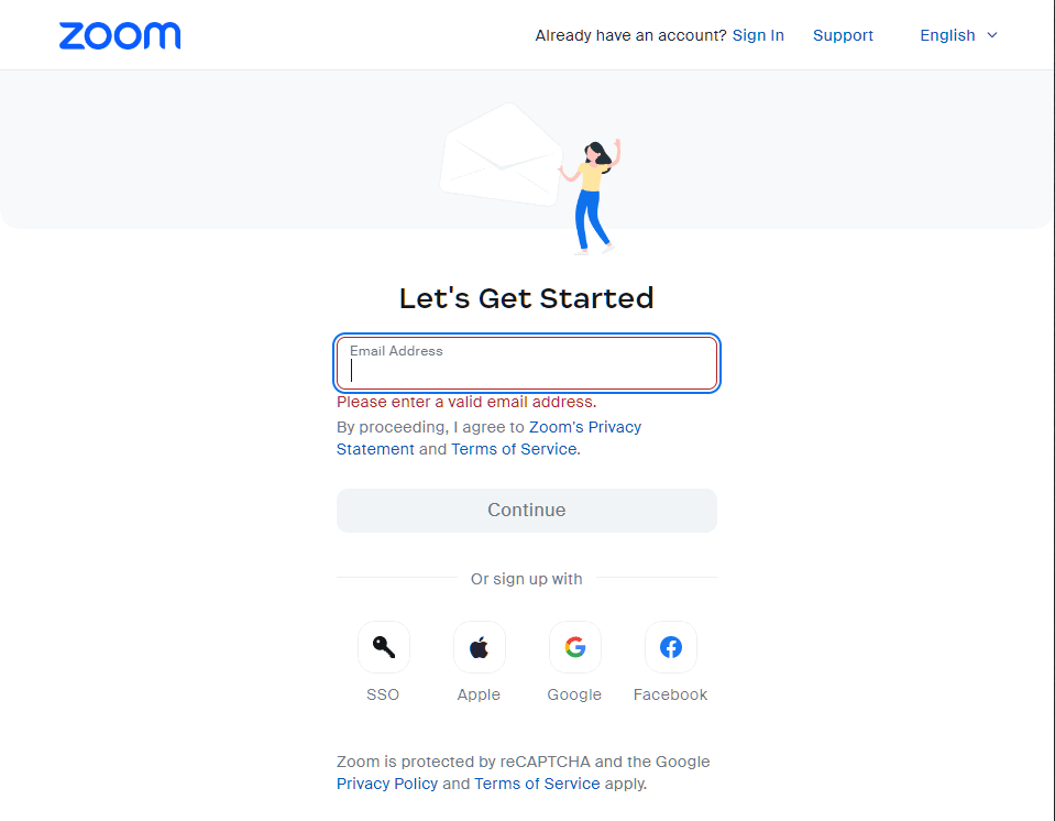 จากนั้นใส่อีเมลสำหรับให้เชื่อมต่อใช้งานกับ Zoom หรือจะเลือกสมัคร (Sign up) ผ่าน SSO, Apple ID, บัญชี Google หรือ บัญชี Facebook ก็ได้