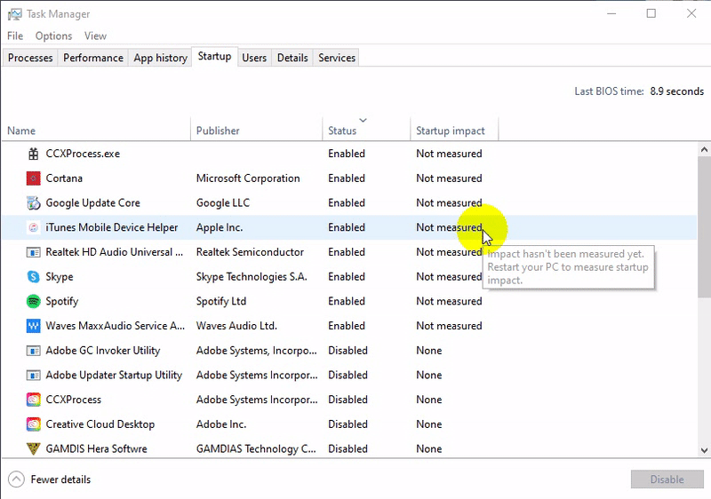 วิธีแก้ไข คือ ให้เราคลิกขวาที่ "ปุ่ม Start" แล้วเลือก "เมนู Task Manager" ไปที่ "แท็บ Startup" เพื่อตรวจสอบรายชื่อซอฟต์แวร์ที่ถูกเปิดใช้งาน (Enabled) ในขณะบูตเครื่อง เอาไว้อยู่ ตัวไหนไม่ใช้ ให้เราคลิกขวา แล้วเลือก "เมนู Disable" ไปครับ