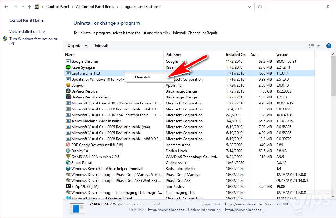 เมื่อเข้าไปแล้ว ให้ลองไล่ดูว่ามีซอฟต์แวร์ตัวไหนที่มีอยู่ในเครื่องแล้วไม่ได้ใช้งาน ตัวไหนที่ไม่ใช้ ให้เราคลิกขวาที่ชื่อซอฟต์แวร์แล้ว "เลือก Uninstall"