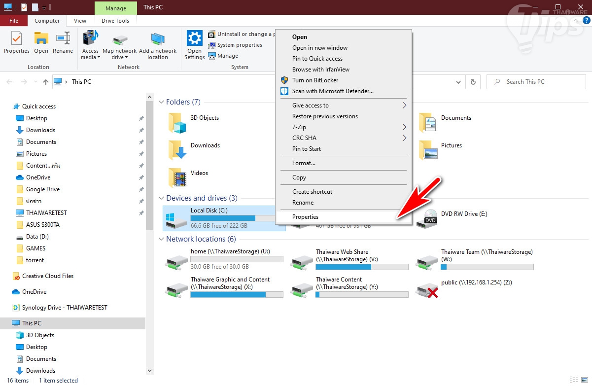 โดยให้เรา "คลิกขวาที่ไดร์ฟที่ต้องการทำ" แล้วเลือก "เมนู Properties"