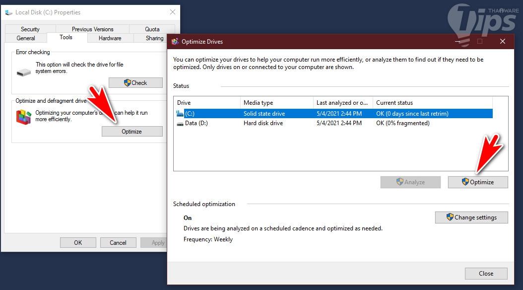 ไปที่ "แท็บ Tools" แล้วคลิก "ปุ่ม Optimize" เลือกไดร์ฟที่ต้องการแล้วคลิกที่ "ปุ่ม Optimize" อีกครั้งครับ หากไม่เคยทำมาก่อนเลย ในการทำครั้งแรกจะใช้เวลาค่อนข้างนานนะ แต่ถ้าทำเป็นประจำอยู่แล้ว ขั้นตอนนี้จะใช้เวลาไม่นาน