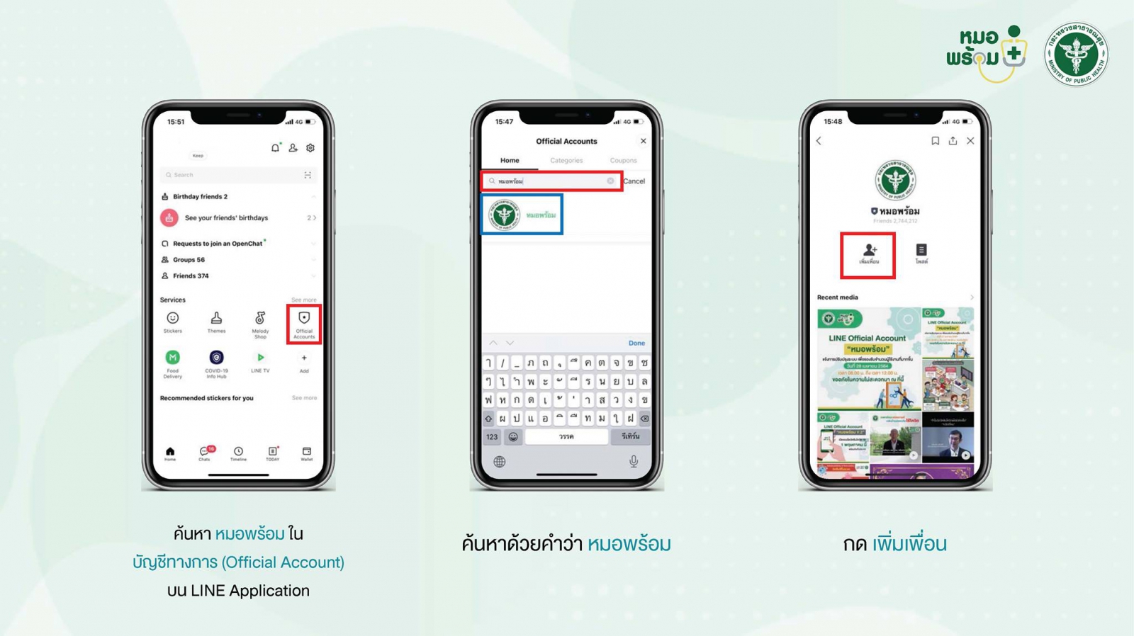 สำหรับผู้ที่ไม่สะดวกลงแอปพลิเคชันในมือถือ ก็สามารถเลือกที่จะ สมัครผ่านไลน์ LINE Official Account หมอพร้อม ได้เช่นกัน โดยสามารถเพิ่มเพื่อน LINE Official Account หมอพร้อม ได้สองรูปแบบคือ