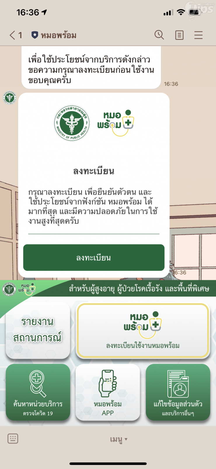 หลังจากที่เพิ่มเพื่อน หมอพร้อม เสร็จแล้วเรียบร้อย ก็ได้เวลาลงทะเบียนเพื่อใช้งานหมอพร้อม โดยการคลิกที่ "ปุ่มสีเขียว" ที่มีคำว่า "ลงทะเบียน" หรือคลิกที่ "ปุ่มลงทะเบียนใช้งานหมอพร้อม"