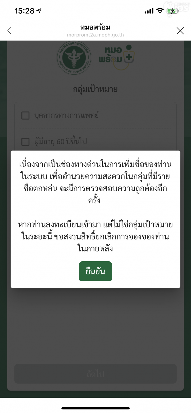 เลือกกลุ่มเป้าหมายในการลงทะเบียน ในที่นี้ เราทดลองเลือกเป็น "ประชาชนทั่วไป" แล้วกด "ปุ่มถัดไป" ซึ่งหลังจากกด "ปุ่มถัดไป" จะมีหน้าต่างแจ้งขึ้นเลยว่า เราจะยังไม่สามารถเข้ารับการฉีดวัคซีนได้ ซึ่งจะเปิดให้เข้ารับการฉีดวัคซีนเฉพาะกลุ่มเป้าหมายเท่านั้น