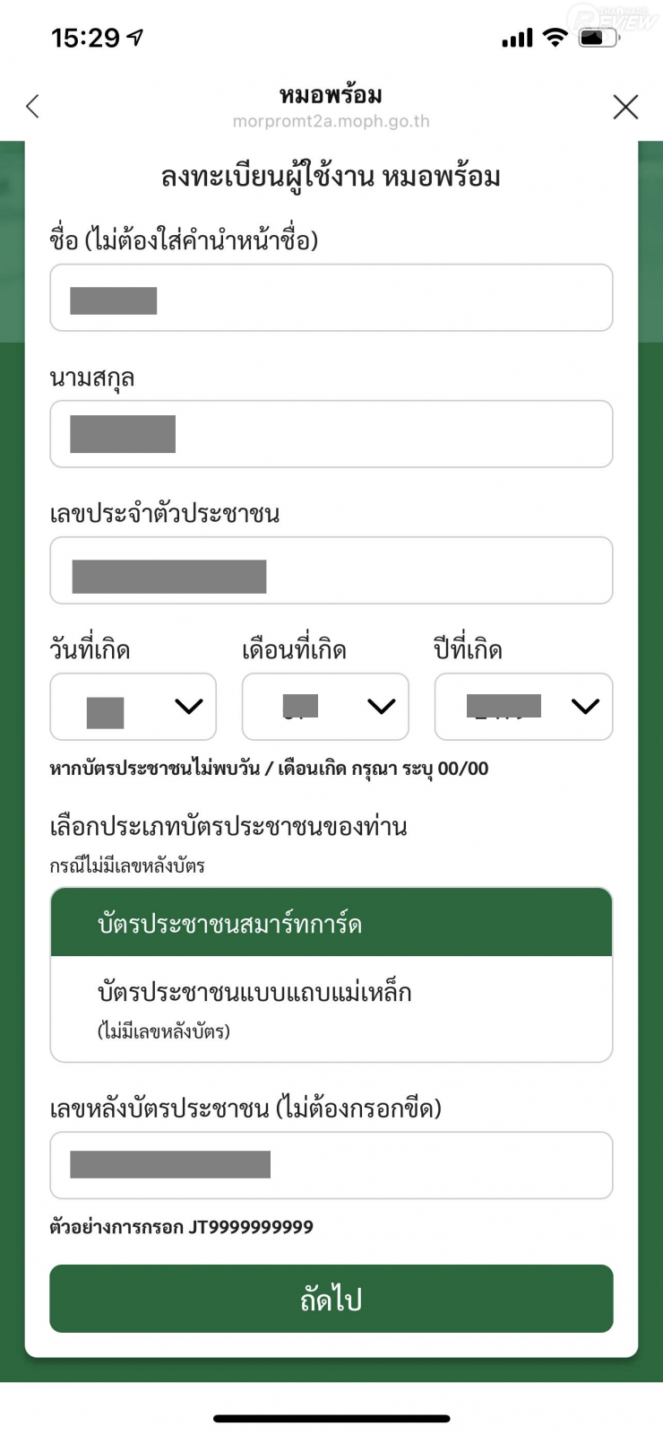 เมื่อกดรับทราบเสร็จเรียบร้อย จะถูกส่งต่อมาที่หน้าลงทะเบียนผู้ใช้งาน หมอพร้อม ให้เรากรอกข้อมูลลงไปตามแบบฟอร์มที่มีให้แล้วกด "ปุ่มถัดไป" และหลังจากนั้นจะมีข้อความหน้าต่างเล็กแสดงขึ้นมาชี้แจงถึงการลงทะเบียน ให้กด "ปุ่มยืนยัน"