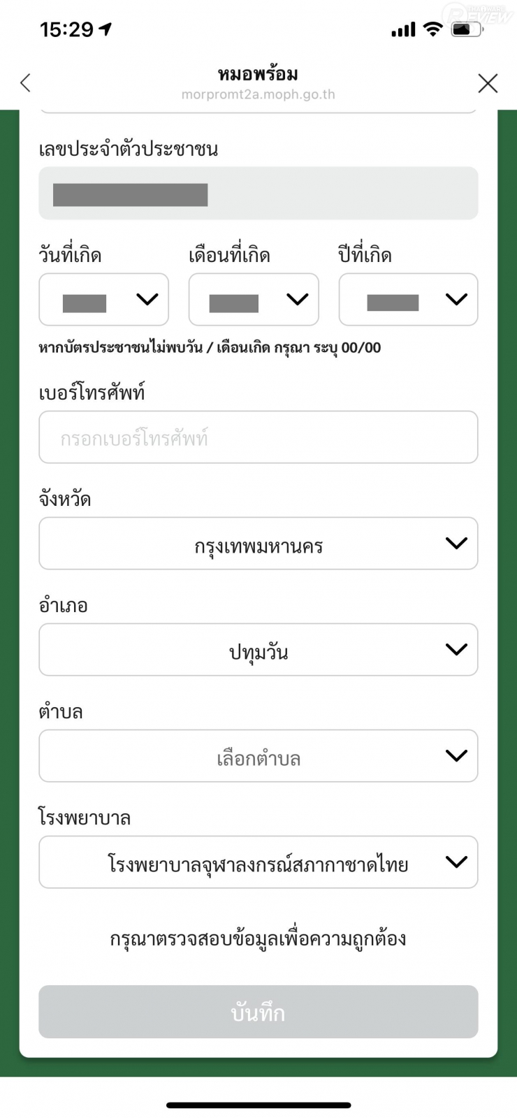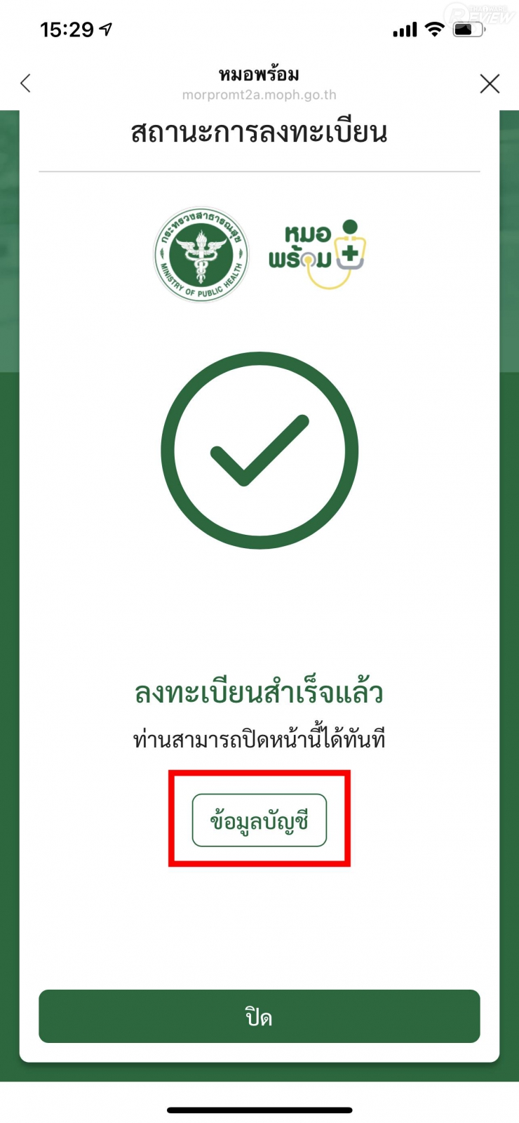 จากนั้น จะมีให้กรอกเบอร์โทรศัพท์ที่สามารถติดต่อได้ จังหวัด อำเภอ และตำบลที่เป็นที่อยู่อาศัยในปัจจุบัน และจะมีให้เลือกสถานพยาบาลที่ต้องการขอรับวัคซีน เมื่อเลือกเสร็จแล้วให้กด "ปุ่มถัดไป" จะมีหน้าต่างแจ้งสถานะการลงทะเบียนสำเร็จขึ้นมา กด "ปุ่มปิด" เพื่อปิดหน้าจอการลงทะเบียน แต่หากต้องการจองคิวฉีดวัคซีนต่อสามารถอ่านวิธีจองคิวฉีดวัคซีนต่อด้านล่างได้เลย