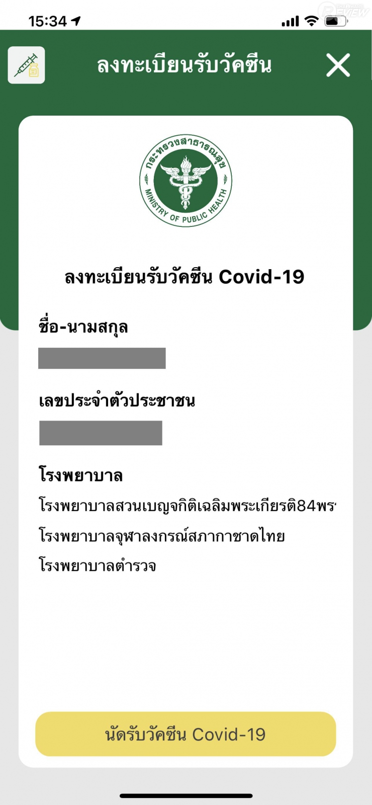 หลังจากที่ถูกส่งมาในหน้านี้ ให้กดที่ "เมนูลงทะเบียนรับวัคซีน COVID-19" โดยจะมีหน้าจอยืนยันข้อมูลส่วนตัวที่ลงทะเบียนไว้ และสถานพยาบาลที่เราเคยมีประวัติการรักษา และ/หรือ สถานพยาบาลที่ใกล้เคียงกับที่อยู่ตามบัตรประชาชน เมื่อตรวจสอบข้อมูลถูกต้องให้กดที่ "ปุ่มนัดรับวัคซีน COVID-19"