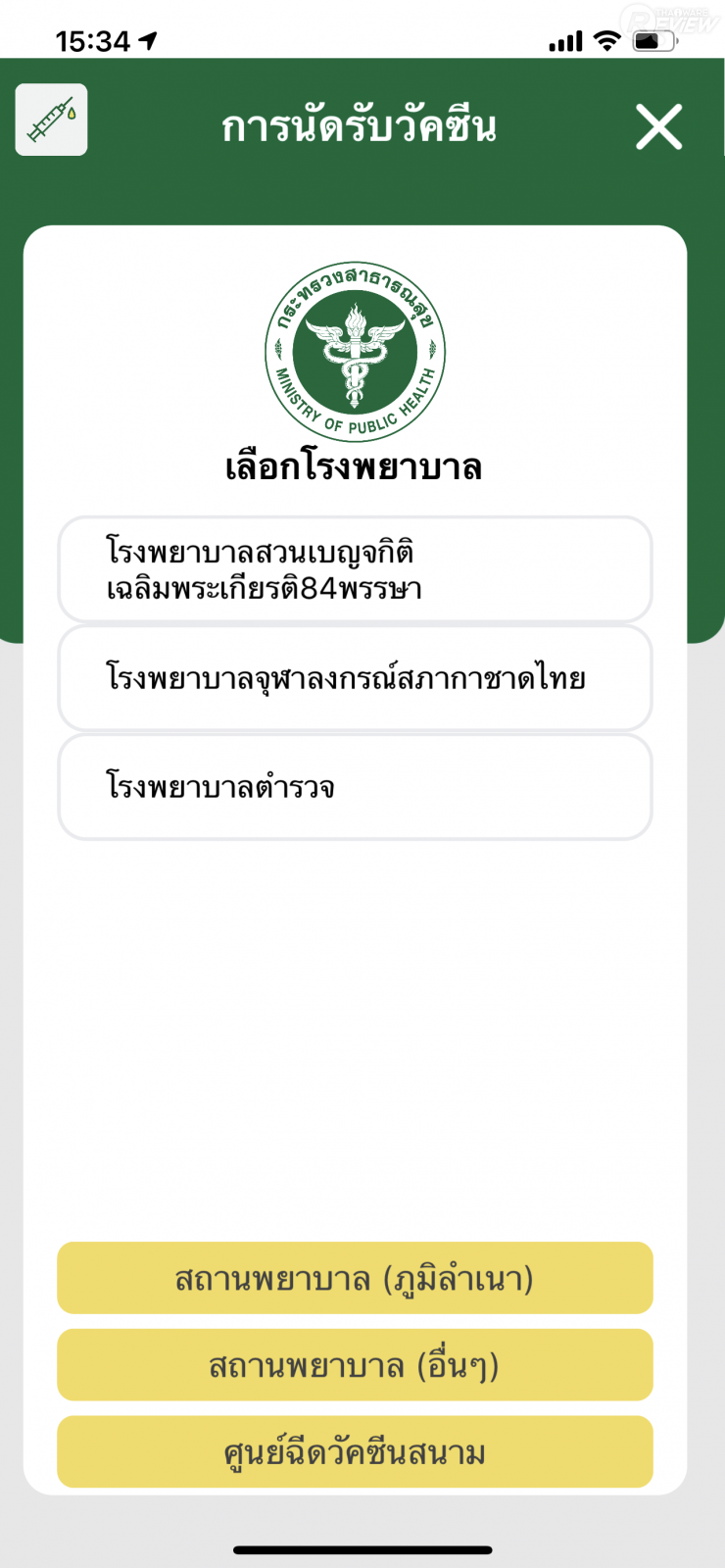 ในหน้าถัดมาจะปรากฎรายชื่อสถานพยาบาลที่จะมีให้เลือกวันและเวลาที่ต้องการฉีดวัคซีน สามารถกดที่ชื่อสถานพยาบาลที่ต้องการได้ทันที แต่ถ้าหากต้องการเลือกสถานพยาบาลอื่น ๆ นอกเหนือจากที่ปรากฎ ให้คลิกที่ปุ่มตัวเลือกด้านล่างว่าต้องการฉีดที่สถานพยาบาลประเภทใด