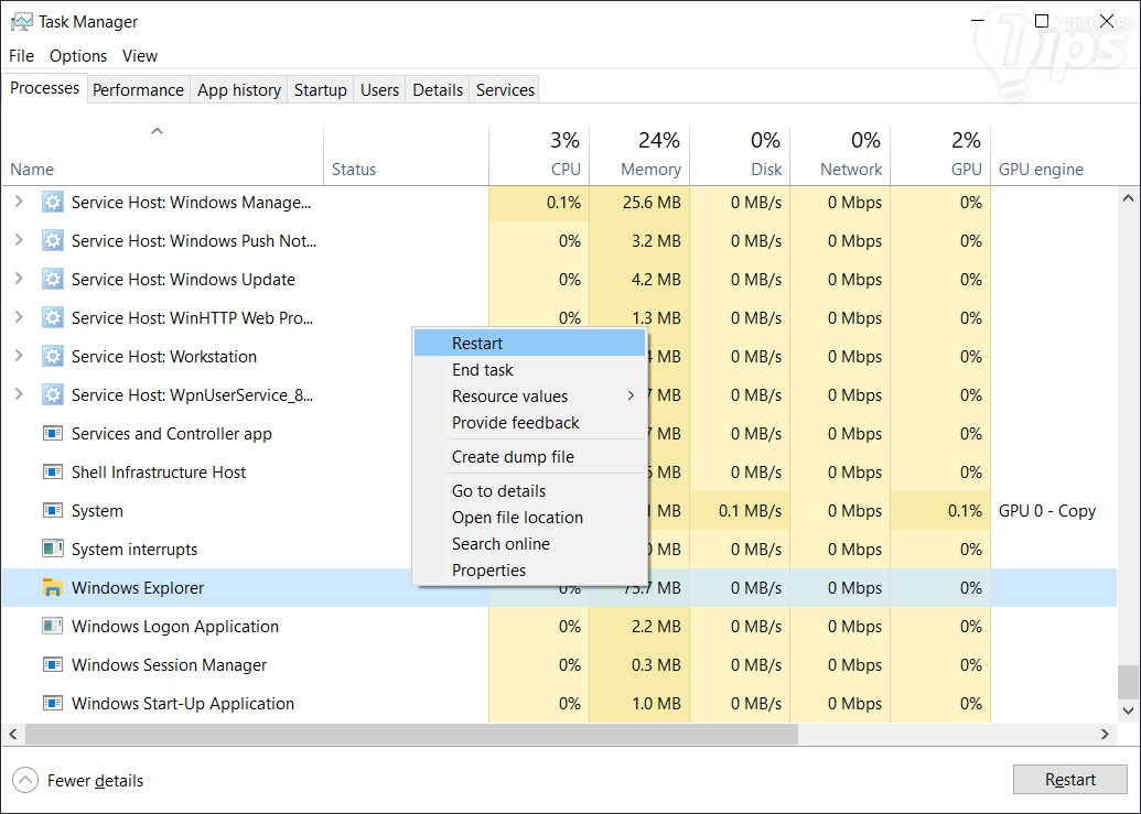 โดยให้เราเปิด Task Manager ขึ้นมา ไปที่ "แท็บ Processes" มองหา "Windows Explorer" แล้วคลิกขวาเลือก "เมนู Restart" เพื่อปิดการทำงานของมัน และเริ่มต้นใหม่อีกครั้ง