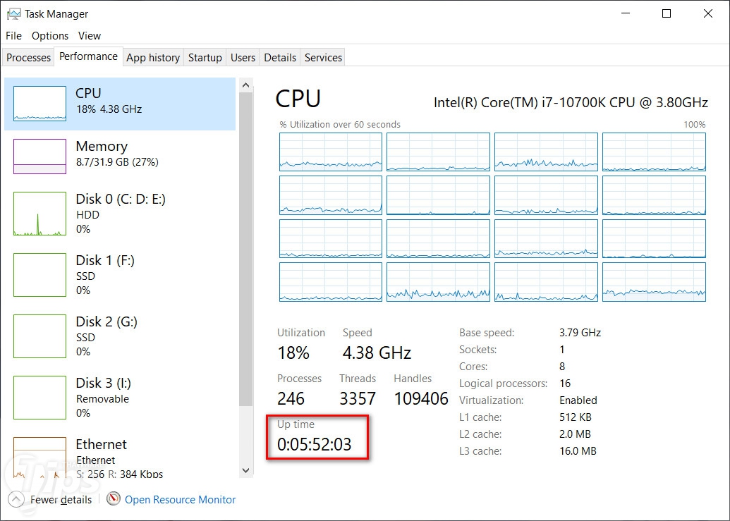 ในหน้าข้อมูลของ "แท็บ Performance" ก็ยังมีข้อมูลน่าสนใจอีกหลายอย่าง อย่างใน "หัวข้อ CPU" เราจะเห็น "Up time" ตรงนั้นจะมีบอกเวลาที่เริ่มนับตั้งแต่ที่เปิดเครื่องเข้าสู่ Windows