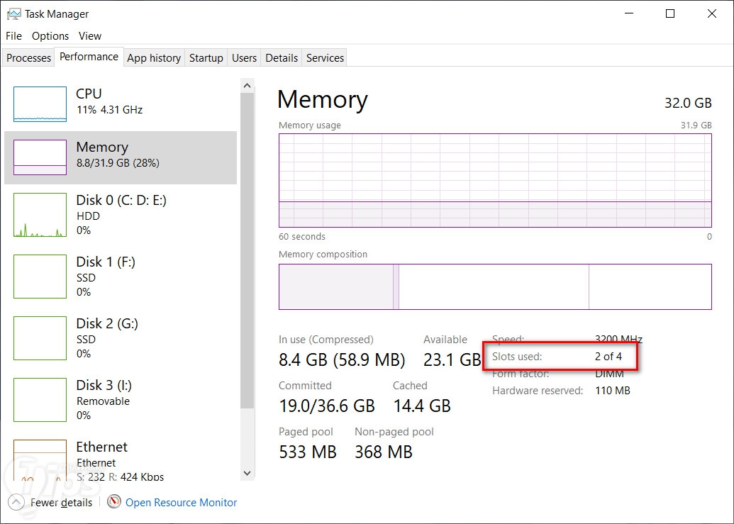 ตรง Memory เราสามารถตรวจสอบจำนวนสล็อตแรมที่ถูกใช้งานไปแล้วได้ เผื่อต้องการซื้อแรมมาใส่เพิ่ม จะได้วางแผนได้อย่างเหมาะสม
