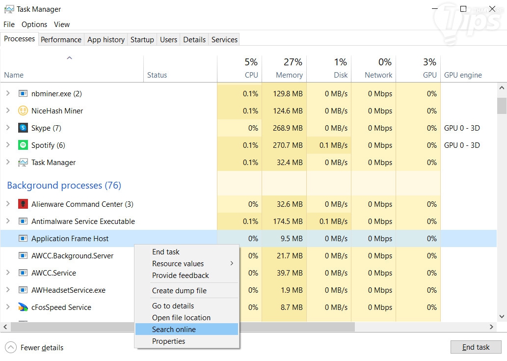 ซึ่งใน Task Manager ก็มีเครื่องมือช่วยให้เราค้นหาข้อมูลได้ง่าย ๆ อยู่ด้วยนะ โดยให้เรา "คลิกขวา" ที่ "ชื่อ Process" ที่เราอยากรู้ว่ามันคืออะไร แล้วหลังจากนั้นให้คลิกที่ "เมนู Search Online" มันจะทำการเปิดเว็บไซต์ "Bing" บน เว็บเบราว์เซอร์ เพื่อค้นหาข้อมูลให้อัตโนมัติ