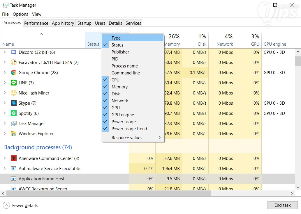 ค่าเริ่มต้นของ Task Manager จะแสดงผลข้อมูลเอาไว้เพียงไม่กี่คอลัมน์เท่านั้น ซึ่งก็จะเป็นข้อมูลที่มีความสำคัญ แต่เราสามารถเพิ่มคอลัมน์เพื่อแสดงข้อมูลเพิ่มเติมได้ ด้วยการ "คลิกขวา" ที่บริเวณ "Header" แล้วเลือกเพิ่มคอลัมน์ที่ต้องการ