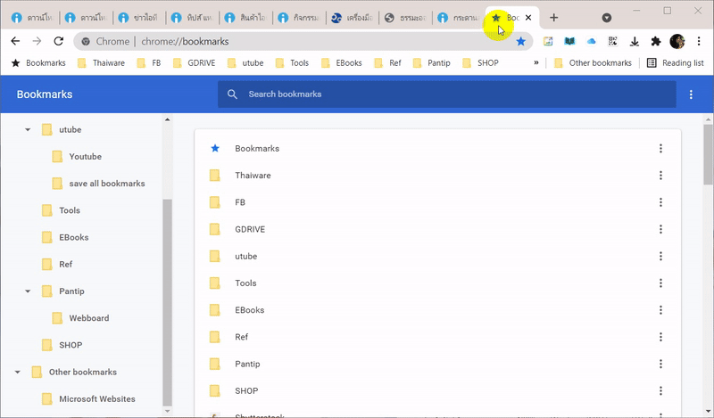 จากนั้น บนแป้นคีย์บอร์ดให้เรากด "ปุ่ม Ctrl + Shift + O" เพื่อเปิดหน้าต่าง การจัดการบุ๊คมาร์ค (Bookmark Manager) ขึ้นมา คลิกที่โฟลเดอร์ที่เราเพิ่งสร้างขึ้นมาในขั้นตอนก่อนหน้านี้ จะเห็นว่ามี URL ของแท็บทั้งหมดที่เรากำลังเปิดเอาไว้อยู่