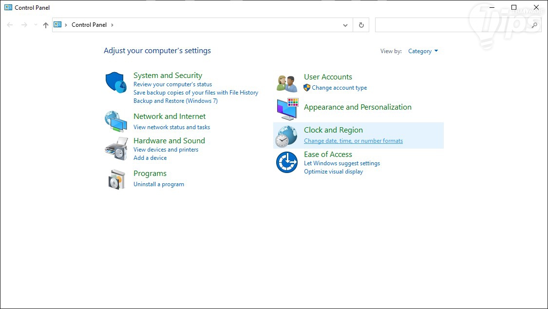 2. เมื่ออยู่ในหน้าต่าง Control Panel คลิกเลือก "เมนู Clock and Region"