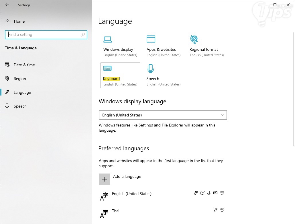 3. ในหน้าต่างใหม่ที่ปรากฎขึ้นมา ที่ "เมนู Time & Language" ด้านซ้าย เลือก "เมนู Language" แล้วคลิกที่ "เมนู Keyboard"