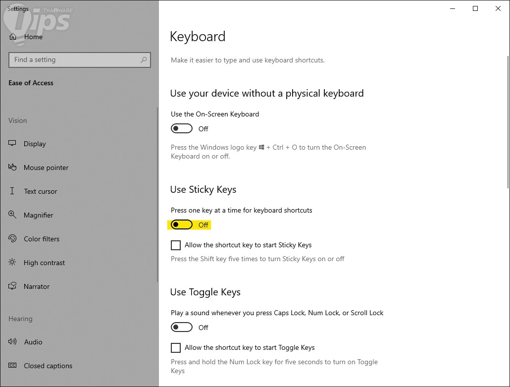 2. ใน "หน้าต่าง Settings" เลื่อนหา "เมนู Use Sticky Keys" แล้วคลิกที่ตัวเลือกใต้เมนูให้เปลี่ยนเป็นคำว่า Off