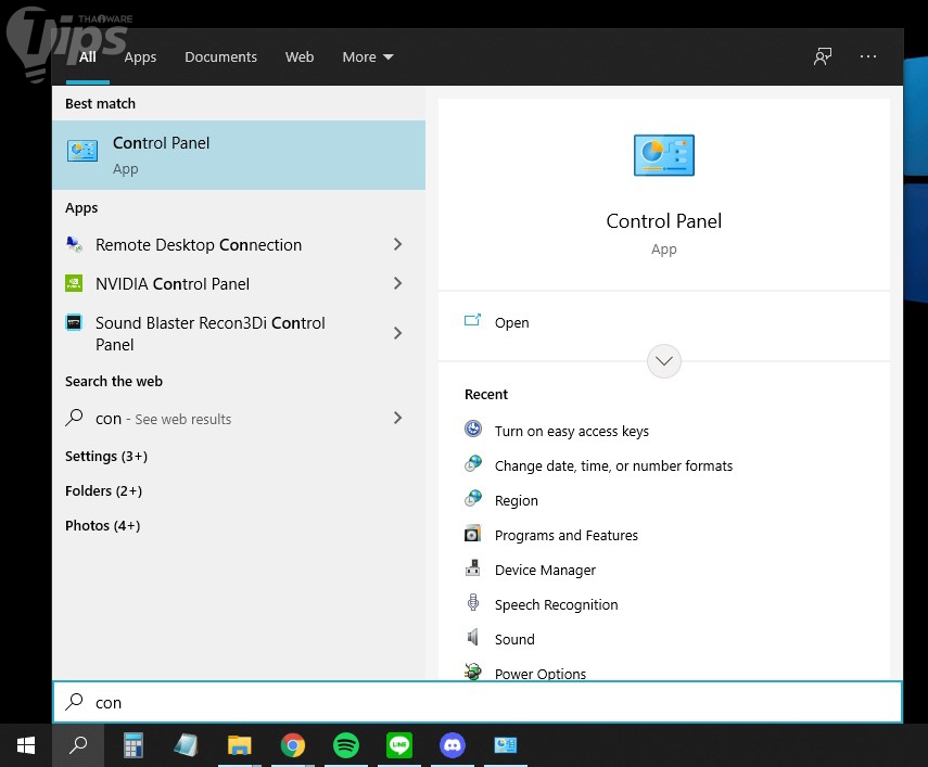 1. ไปที่ "เมนู Search" หรือ "ปุ่มรูป แว่นขยาย" ที่บริเวณแถบ Taskbar ด้านล่าง แล้วพิมพ์คำว่า Con ลงไป คลิกเลือก "เมนู Control Panel"