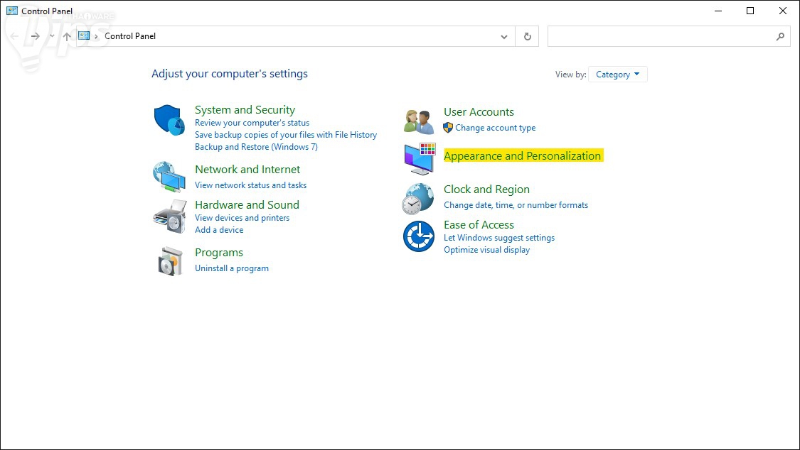 2. .ใน "หน้าต่าง Control Panel" คลิกที่ "เมนู Appearance and Personalization"