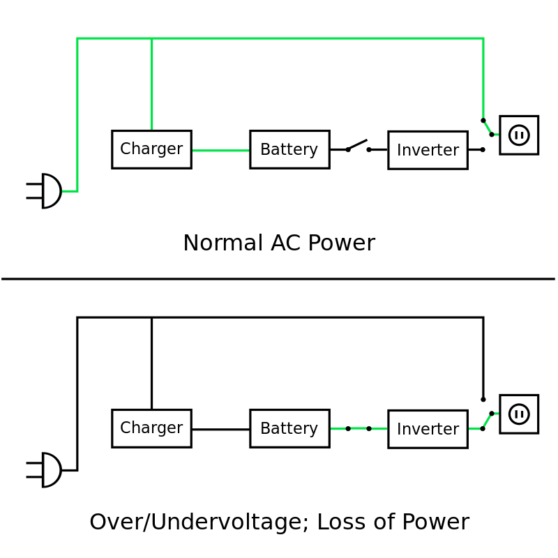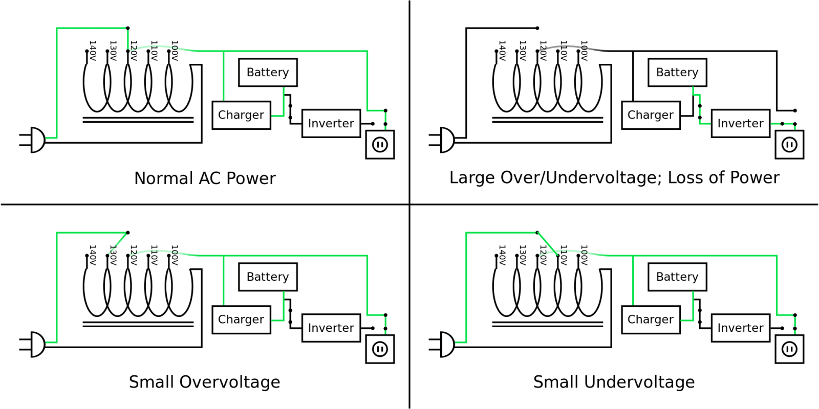 ในสภาวะไฟฟ้าปกติ อุปกรณ์ไฟฟ้า (Load) จะได้รับพลังงานไฟฟ้าจากแหล่งจ่ายพลังงานไฟฟ้าหลัก ที่มาจากจากการไฟฟ้าโดยตรง และในขณะเดียวกัน เครื่องก็จะทำการชาร์จประจุกระแสไฟฟ้าให้กับแบตเตอรี่ไปด้วยพร้อมๆ กัน แต่เวลาที่ไฟฟ้าที่จ่ายโดยการไฟฟ้าดับ แบตเตอรี่จะจ่ายพลังงานไฟฟ้า กับเครื่องแปลงกระแสไฟฟ้า (Inverter) เพื่อแปลงกระแสไฟฟ้าและจ่ายให้กับอุปกรณ์ไฟฟ้า โดยใช้ตัวสับเปลี่ยน (Tranfer Switch) สำหรับเลือกแหล่งจ่ายพลังงานไฟฟ้าระหว่างระบบจ่ายพลังงานไฟฟ้าหรือเครื่องแปลงกระแสไฟฟ้า