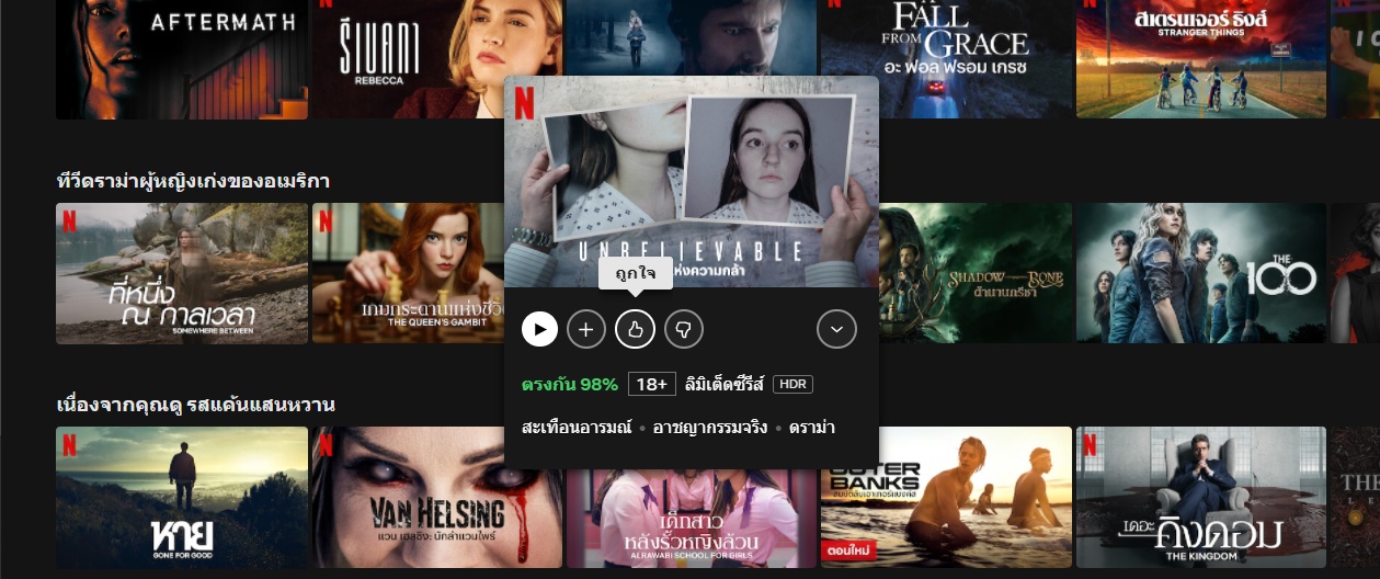 เมื่อเจอหนัง-ซีรีส์ที่ชอบ อย่าลืมกด “ถูกใจ” ให้ Netflix รู้ เราจะช่วยแนะนำเนื้อหาที่คล้ายกันมาให้ หรือถ้าไม่ค่อยปลื้ม ก็กด “ไม่ถูกใจ” ตามสบาย โดยสามารถทำได้ง่าย ๆ ดังนี้