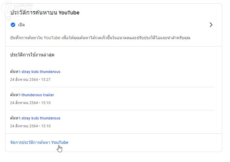 2. เลื่อนลงมาด้านล่าง ไปที่ "เมนู ประวัติการค้นหาบน YouTube (YouTube Search History) และคลิกที่ "เมนู จัดการประวัติการค้นหา YouTube"