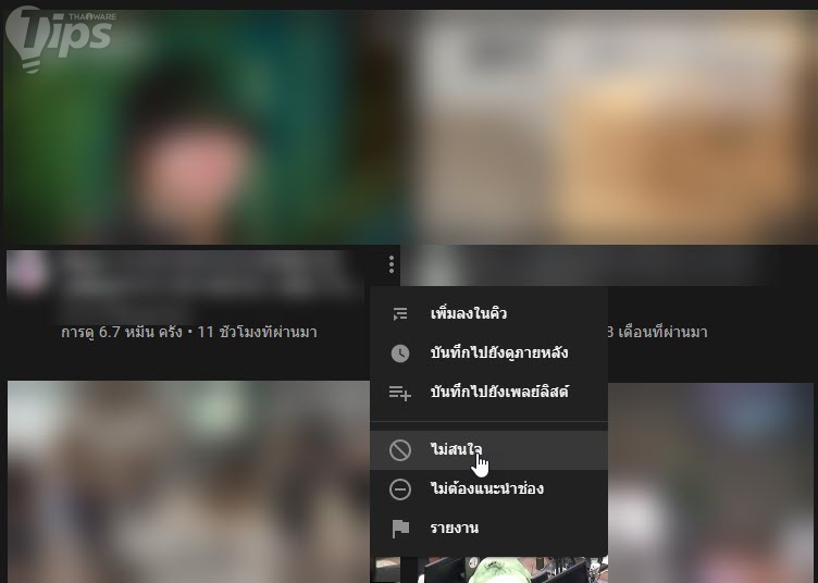 สามารถทำได้โดยการเลื่อนเมาส์ไปที่ บริเวณท้ายแคปชันใต้คลิปที่เราไม่สนใจ คลิกที่ "เมนู 3 จุดไข่ปลาแนวตั้ง" แล้วเลือก "เมนู ไม่สนใจ (Not Interested)" ก็จะเป็นการกรองคลิปที่คล้ายกันออกไปให้น้อยลงได้ในระดับหนึ่งแล้วล่ะ