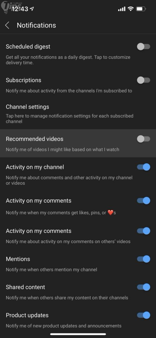 2. แตะเลือก "เมนู Notifications" เพื่อตั้งค่าการแจ้งเตือนจากแอป YouTube จากนั้นให้มองหา "เมนู Recommended Videos" แล้วแตะเพื่อเลื่อนให้ตัวเลื่อนสีฟ้ากลายเป็นสีเทา เพื่อปิดรับการแจ้งเตือน