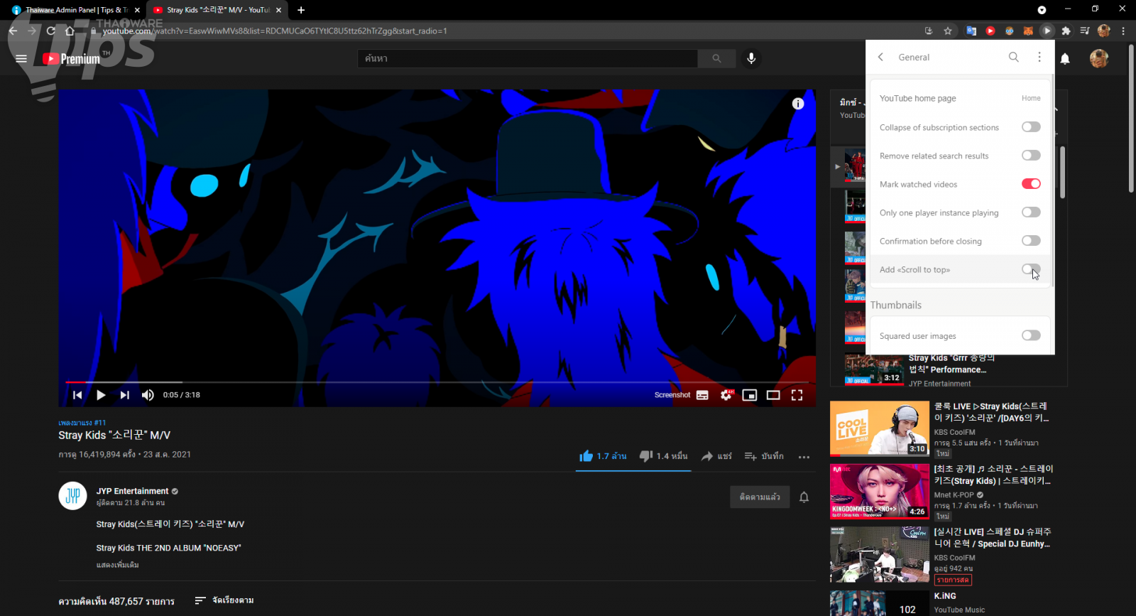 เมนูของส่วนเสริมดังกล่าว ยังสามารถเลือกเปิดปิดการแสดงผลบางส่วนที่ต้องการได้ หรือเลือกปิดคอมเม้นท์และข้อมูลเพิ่มเติมของคลิปได้ด้วย