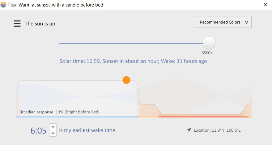 โปรแกรม F.lux เป็นโปรแกรมถนอมสายตาที่น่าสนใจตั้งแต่เริ่มใช้งานครั้งแรก โปรแกรมจะมีค่าสีให้เลือกหลายแบบ เช่น Working Late ก็จะขยายช่วงเวลาการทำงานออกไป, Cave Painting ที่ปรับโทนสีหน้าจอให้คล้ายกับบรรยากาศในถ้ำที่มีแสงน้อย หรือจะค้นหาชื่อเมืองประเทศอื่น ๆ ลงไปแทนก็ได้ อีกทั้งยังตั้งค่าเวลาพระอาทิตย์ขึ้นและพระอาทิตย์ตกได้ อีกทั้งยังสามารถค้นหาชื่อเมืองของประเทศอื่น ๆ เพื่อให้โปรแกรมแสดงแสงสีของเมืองนั้น ๆ