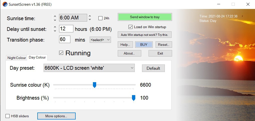 โปรแกรม SunsetScreen เป็นโปรแกรมปรับความสว่างจอคอมพิวเตอร์ ที่มีความสามารถครบครัน ถึงแม้หน้าตาโปรแกรมดูซับซ้อนไปนิด แต่ขอบอกเลยว่าใช้งานง่ายมาก ๆ สามารถตั้งค่าความสว่างและอุณหภูมิของแสงได้อย่างละเอียด รวมถึงตั้งเวลาพระอาทิตย์ขึ้นและพระอาทิตย์ตก และระยะเวลาของกลางวัน-กลางคืน บางคนอาจชอบช่วงกลางวันนาน ๆ หรือบางคนอาจชอบโทนสีเวลากลางคืน ก็เลือกเวลาได้ตามชอบ
