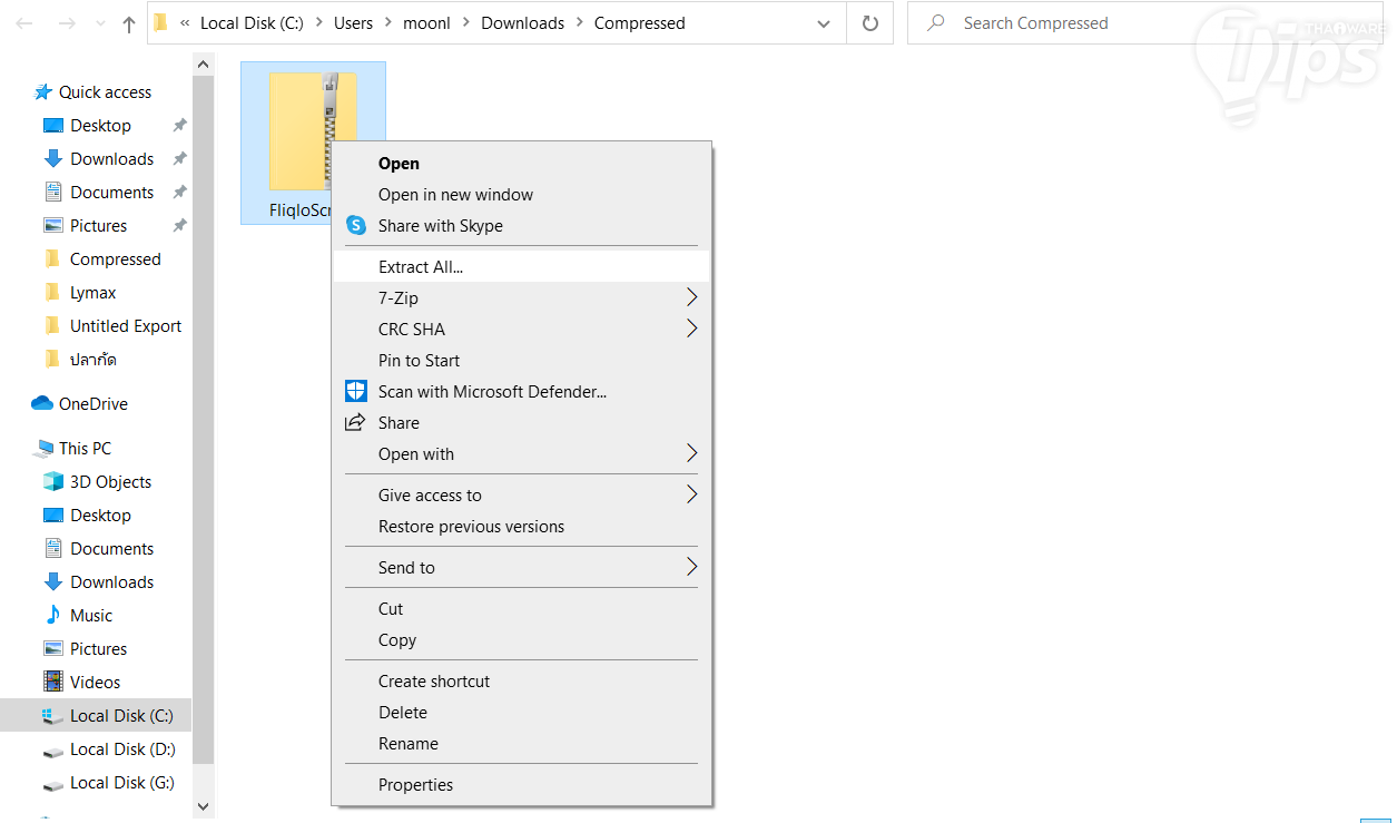 ส่วนมากแล้ว Screensaver ที่แจกให้ดาวน์โหลดตามเว็บไซต์ต่าง ๆ มักจะอยู่ในรูปแบบของไฟล์นามสกุล .ZIP ดังนั้น เมื่อดาวน์โหลดมาแล้ว ให้ทำการแตกไฟล์ให้เรียบร้อยก่อนที่จะติดตั้งนะ ซึ่งในระบบปฏิบัติการ Windows 10 จะสามารถแตกไฟล์ได้อยู่แล้ว โดยไม่จำเป็นต้องติดตั้งโปรแกรมเพิ่มเติม ด้วยการ "คลิกขวา" ที่ไฟล์ .ZIP แล้วเลือก "Extract All..."