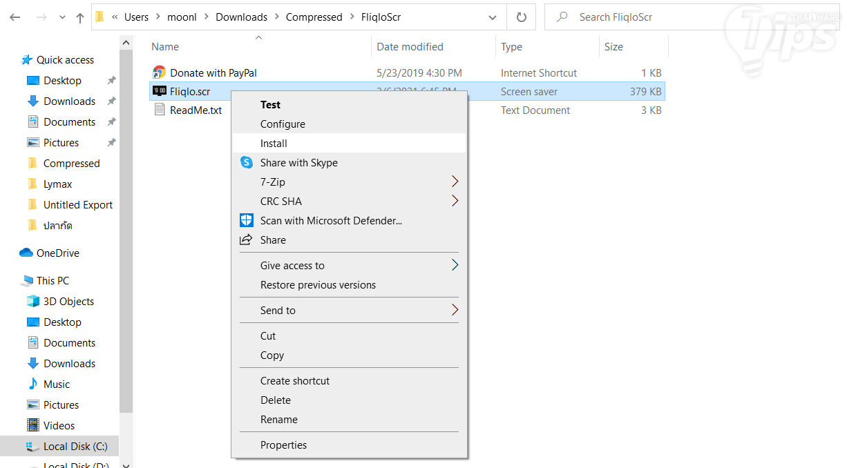ไฟล์ Screensaver ที่ได้มา มักจะมีอยู่ 2 รูปแบบ คือ ไฟล์ .EXE และ .SCR หากเป็น ".EXE" ก็ให้เรา "ดับเบิลคลิก" เพื่อติดตั้งได้เลย ส่วนถ้าเป็น ".SCR" ให้เรา "คลิกขวา" แล้วเลือกที่ "เมนู Install"
