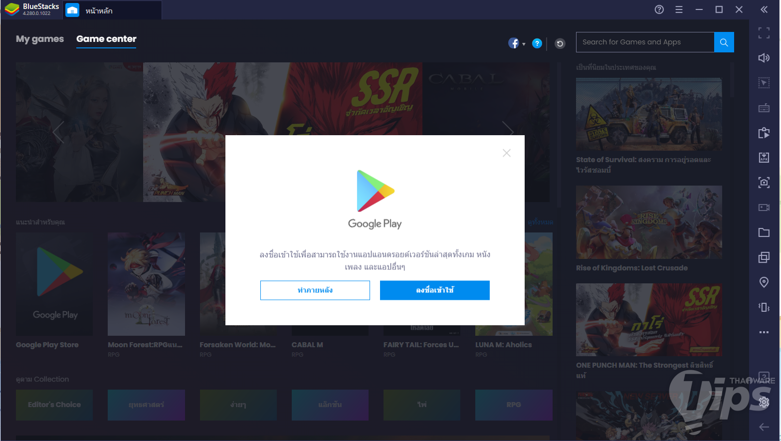 เมื่อเปิดหน้า โปรแกรม BlueStacks 4 ขึ้นมา จะปรากฏหน้าต่างของแอป Google Play Store หากต้องการดาวน์โหลดแอปพลิเคชัน ก็อย่าลืมเข้าสู่ระบบ (Login) บัญชี Google ก่อนใช้งาน หรือถ้าอยากค้นหาเกมเฉย ๆ ก็เลือกกดปุ่ม "ทำภายหลัง" แทนก็ได้