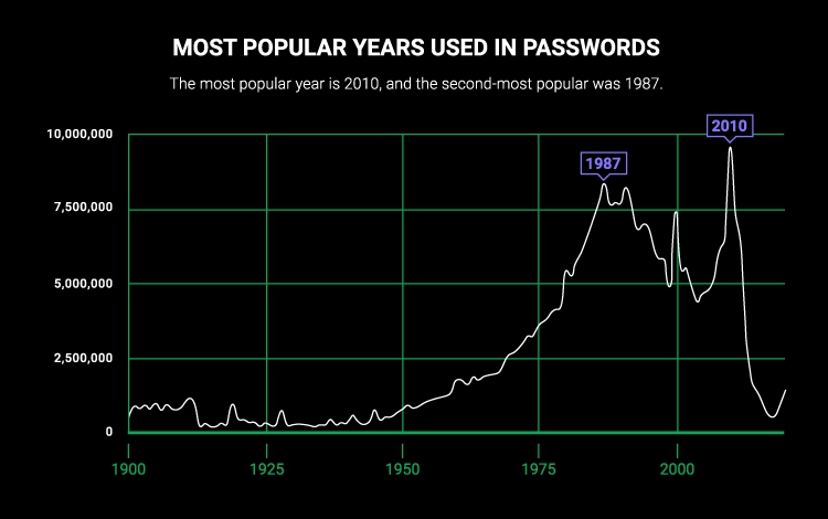 มีคนอยู่มากที่ชอบตั้งปีคริสต์ศักราชผสมลงไปในรหัสผ่านส่วนตัว (ถ้าบ้านเราก็คงใช้พุทธศักราช) และชุดตัวเลขที่ถูกพบมากอยู่มากคือ 1900 - 2020 หรือ ค.ศ. 1900 - 2020 (พ.ศ. 2446 - 2563) และในขั้นแรกได้มีการตั้งสันนิษฐานคร่าว ๆ ว่าคนส่วนใหญ่อาจเลือกจาก