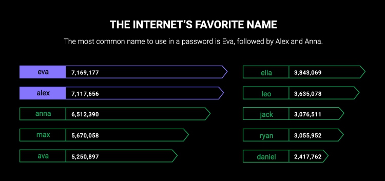 อันดับ 1 คือ ชื่อ 'eva' (อีวา หรือ อีฟ) ถูกนำมาตั้งเป็นรหัสผ่านทั้งหมด 7,169,177 รายการ เยอะมาก ๆ ไม่รู้ทำไมมีคนชื่อ eva เยอะขนาดนี้ ส่วนอันดับ 2 ก็คือ 'alex' (อเล็ก) ถูกนำมาตั้งเป็นรหัสผ่านทั้งหมด 7,117,656 รายการ เรียกว่าตามอันดับ 1 มาติด ๆ จากนั้นก็ไล่มาตามภาพ