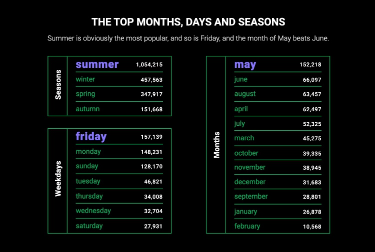 จากภาพในหมวดฤดูกาลพบคำว่า Summer (หรือฤดูร้อน) คือชื่อที่นิยมตั้งเป็นรหัสมากถึง 1,054,215 รายการขณะที่วันศุกร์ (Friday) ครองอันดับสูงในหมวดวันทั้ง 7 ของสัปดาห์ และในหมวดเดือนก็คือ May หรือเดือนพฤษภาคม ก็มีความนิยมสูงสุด